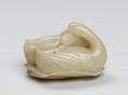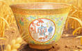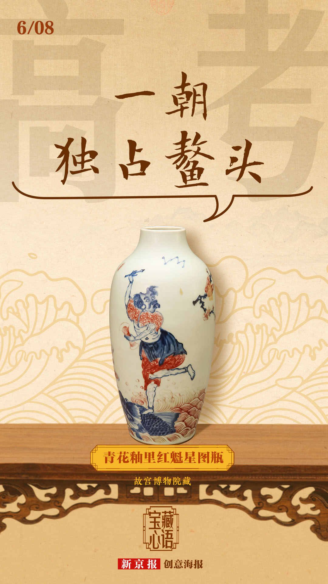 外壁青花釉里红装饰魁星点斗图,一鳌自海水中探头,魁星单足立于鳌头,作奔跑状,回首远眺,高举右手执笔,左手持一银锭,空中绘北斗七星、折枝花纹。上部留白处题行书诗句:“两耳鬓蓬松,文章盖世雄,双眸观北斗,一笔扫场空,鳌头我独占,必定压诸公。”并有二方朱印文。