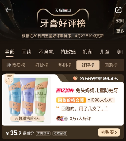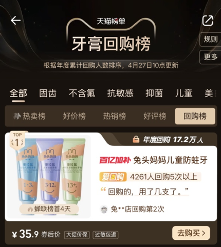 今年1月,母婴品牌兔头妈妈公开表明,攻克德国奥拉氟技术壁垒,自主研发出高纯度奥拉氟,打破这项被欧洲垄断近70年的技术,可实现奥拉氟国产化,且纯度比进口奥拉氟更高,杂质更可控,防蛀性能表现更优异。
