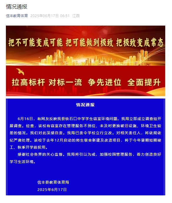 新京报讯 据江西省赣州市信丰县教育体育局消息,6月16日,有网友反映我县铁石口中学学生寝室环境问题。我局立即成立调查组开展调查。经查,该校有寝室存在管理服务不到位、未及时更换破旧设施、环境卫生较差的情况。我们对此深感自责。我局已责令学校立行立改。对相关责任人,将依规依纪严肃处理。该校于去年12月启动的师生宿舍新建及改造项目,将于今年暑期如期竣工、秋季开学前投用。