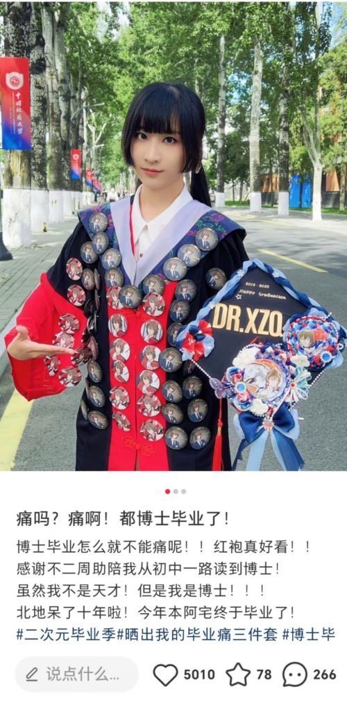 中国地质大学的博士毕业生@冰蓝笑,将陪伴自己从初中到博士阶段的动漫角色吧唧(徽章)缀满学士袍,她不仅穿着这身“痛学士袍”拍完了毕业照,还在博士论文致谢中写下了角色的名字。