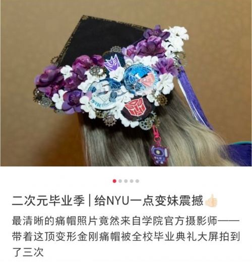 在小红书上,各地大学生纷纷晒出了各式各样的簪谷毕业照,这股风潮甚至刮到了今年毕业的海外留学生群体。今年从纽约大学毕业的留学生@天君,为自己做了一顶变形金刚的痛帽,还被学院官方摄影“送上了全校毕业典礼大屏”。