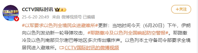 据@CCTV国际时讯 消息,当地时间今天(6月20日)下午,伊朗向以色列发动新一轮导弹攻击,耶路撒冷及以色列全国响起防空警报。耶路撒冷及以色列南部贝尔谢巴等地区多次传出爆炸声。以色列本土守备司令部要求全境居民进入避难所。