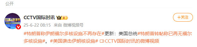 据@CCTV国际时讯 消息,美国总统特朗普转帖称已再无福尔多核设施。