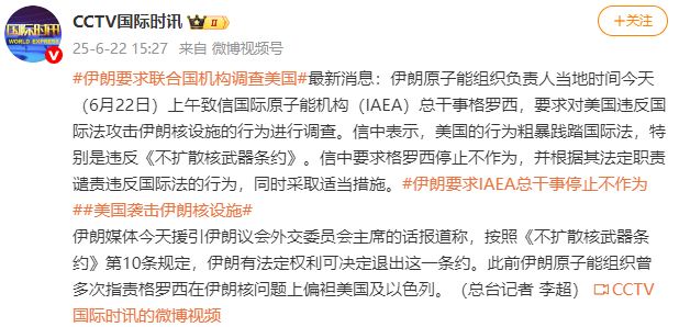 据@CCTV国际时讯 消息,伊朗原子能组织负责人当地时间今天(6月22日)上午致信国际原子能机构(IAEA)总干事格罗西,要求对美国违反国际法攻击伊朗核设施的行为进行调查。信中表示,美国的行为粗暴践踏国际法,特别是违反《不扩散核武器条约》。信中要求格罗西停止不作为,并根据其法定职责谴责违反国际法的行为,同时采取适当措施。