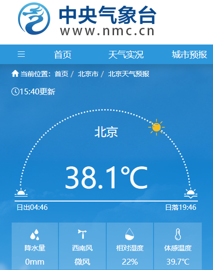 据央视新闻消息,今天截至(6月22日)15:40,北京最高气温达到38.1℃,为今年以来气温新高。预计23日至25日,北京还将出现35℃以上的高温热浪天气,请注意防暑降温!