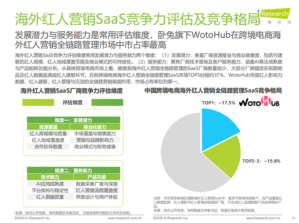 值得注意的是,在该领域中,卧兔网络旗下产品WotoHub凭借其在红人影响力数据分析、高效建联、全流程管理及资产沉淀等方面的全链路赋能优势,以17.5%的市场份额,成为该细分市场的领导者。这印证了能够提供覆盖红人营销全生命周期(筛选-建联-管理-追踪-复盘-沉淀)解决方案的SaaS平台,正成为品牌出海的首选。