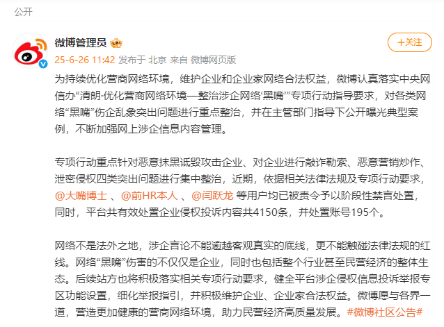 新京报讯 据@微博管理员 消息,为持续优化营商网络环境,维护企业和企业家网络合法权益,微博认真落实中央网信办“清朗·优化营商网络环境—整治涉企网络‘黑嘴’”专项行动指导要求,对各类网络“黑嘴”伤企乱象突出问题进行重点整治,并在主管部门指导下公开曝光典型案例,不断加强网上涉企信息内容管理。
