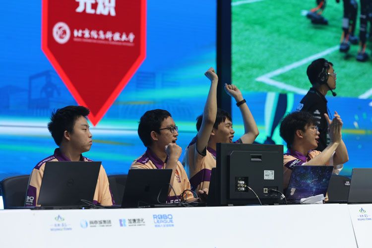 北京信息科技大学Blaze光炽队庆祝进球。面对不同的对手和场上形势变化,机器人选手都要有不同的应对策略。