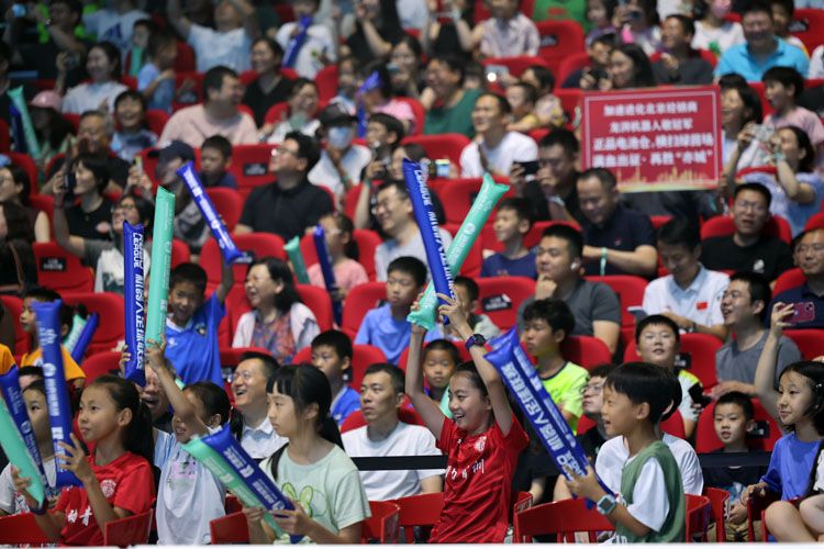 6月28日,2025世界人形机器人运动会的首场测试赛,同时也是国内首场机器人足球3V3 AI 赛,在北京亦庄北京智慧电竞赛事中心打响。图为小学生与机器人一起入场。