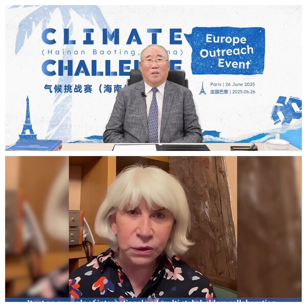 图:中国气候变化事务首任特使解振华与欧洲气候基金会首席执行官、法国前气候变化谈判大使劳伦斯·图比娅娜视频致辞