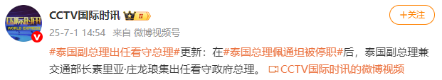 据CCTV国际时讯微博消息,在泰国总理佩通坦被停职后,泰国副总理兼交通部长素里亚·庄龙琅集出任看守政府总理。