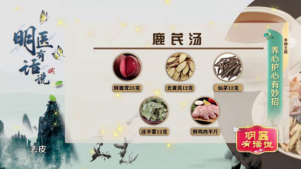 除了教会大家“察颜观色”识风险,《明医有话说》这一期专题更倾情奉献了一道操作简便、适合居家调养的药食同源护心方——鹿芪汤。此方立足中医“补气活血、温阳通脉”的理论,精选常用食材药材,经古方改良后,温和且适合家庭场景日常滋补。