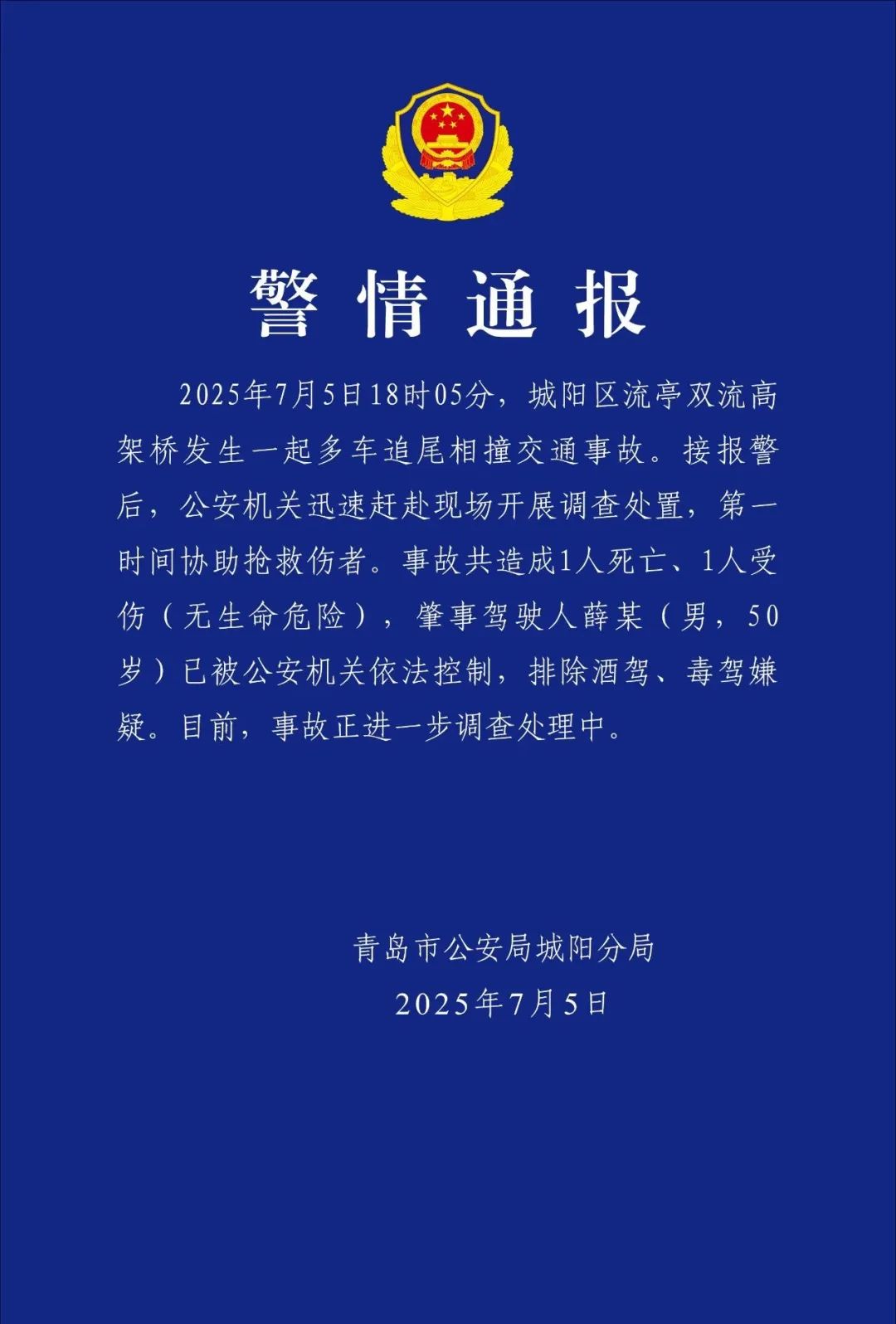 青岛一高架多车追尾致1死1伤,警方:肇事驾驶人已被控制