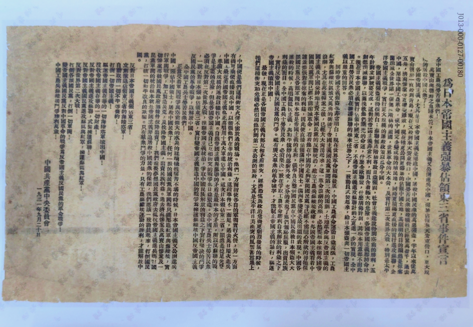 1931年9月20日,中共中央发表的《为日本帝国主义强暴占领东三省事件宣言》