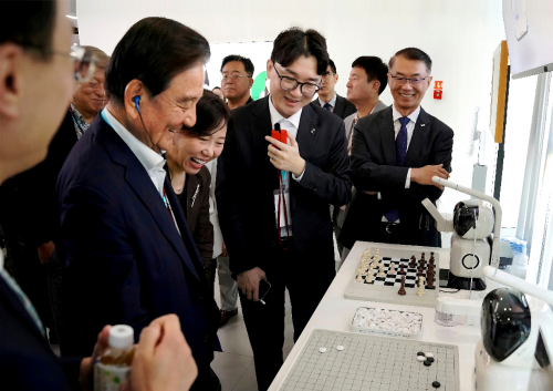 中央集团董事长洪锡炫(左一)在商汤AI体验中心,与元萝卜下棋机器人进行对弈互动。
