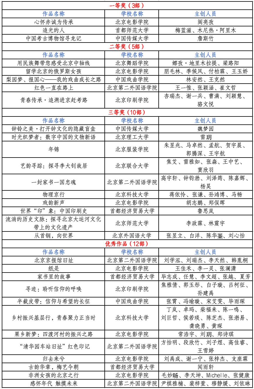 经初筛、初评和专家组终评,2024年度“青春拍客秀”——首都大学生庆祝新中国成立75周年创意随手拍短视频征集展示活动共评出一等奖3部、二等奖5部、三等奖10部、优秀作品12部。获奖名单公示如下:
