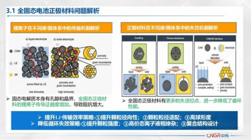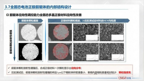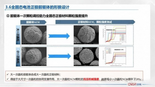 第三个是固态电池前驱体的研发进展。固态电池跟液态电池主要是两个方面的差异,一个是全固态电池正极的锂离子传导迂曲度增加,会导致阻抗增加。另外一个是全固态电池正极在稳压或者循环过程中出现开裂,出现更多的失活位点,进一步降低循环性能。
