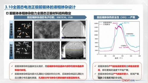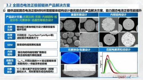 我们针对全固态电池所能够做的设计,主要考虑以下几方面,一个是高能量密度,一个是高安全性,一个是循环性能。我们从前驱体对元素比例、粒度分布、表面形貌、内部结构、结晶性、元素掺杂等各个维度进行研究。