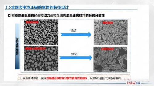 前驱体的分散性对正极材料的分散性还是有比较大的影响。左边两个图,下面是前驱体分散性做的比较好的产品,烧成正极之后,分散性也比较好。从前驱体出发,实现对单晶正极材料分散性更有效的调控,以适配不同尺寸固态电解质。