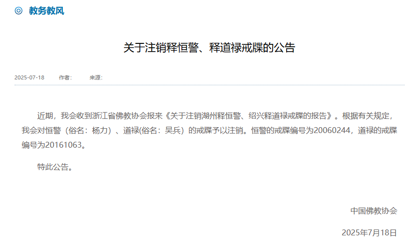 新京报讯 7月18日,中国佛教协会发布关于注销释恒警、释道禄戒牒的公告。