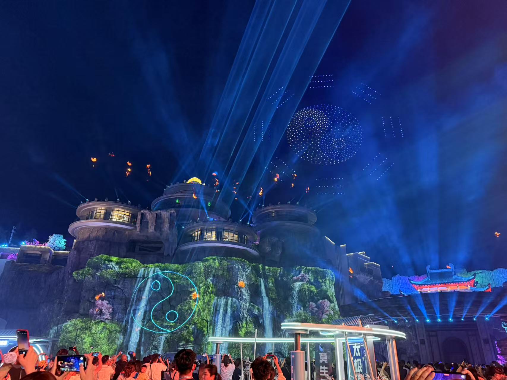“武当一梦”大型演艺综合体前的灯光秀,不少游客在此打卡拍照。新京报记者 张建林 摄