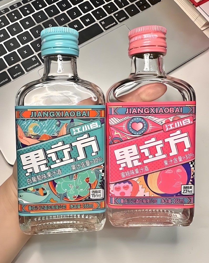 2025年消费者早已厌倦“小甜水”,果立方30%+真实果汁含量和15-23度酒精度恰成破局点。它比传统白酒温和,入口果香掩盖酒精刺激;又比本土果味酒层次丰富,白葡萄与蜜桃味形成降维打击。