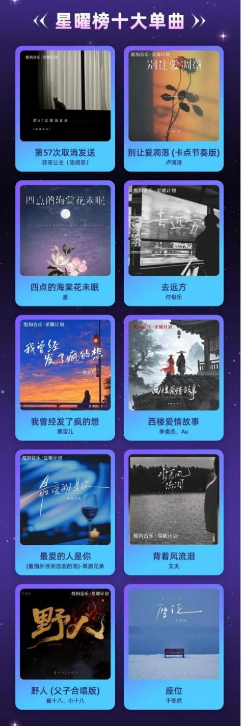 回顾Q2季度,哪些歌曲热度最高?酷狗音乐星曜榜汇聚全网最流行、最能反映当下乐坛风向的热歌。在本季度的十大单曲中,治愈系歌曲整体受欢迎度亮眼。其中,表现爱而不敢言的《第57次取消发送》、具有拯救emo节奏的《别让爱凋落》、静谧诗意的《四点的海棠花未眠》等单曲,收获了广大听众的喜爱与支持。