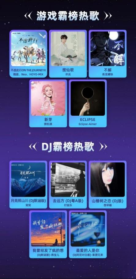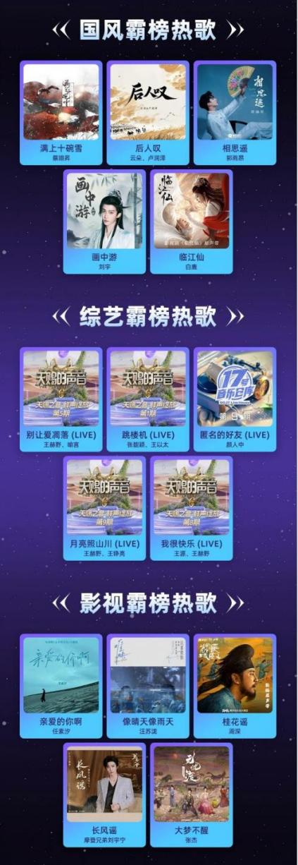 近年来,用户喜爱的音乐具有细分化、场景化、个性化趋势。酷狗音乐星曜榜按照国风、DJ、综艺、影视、游戏等多个场景,分别推出TOP 5霸榜热歌。《满上十碗雪》《后人叹》等歌曲唤起听众的“国风DNA”,DJ赛道杀出《月亮照山川》《去远方》等黑马,《别让爱凋落》《跳楼机》借助热门综艺成为热歌,影视方面的《亲爱的你啊》《像晴天像雨天》迅速走红,《不虚此行》《揽仙歌》等游戏同款歌曲霸榜,从不同垂直场景展示了听众们的音乐偏好,反映出华语乐坛流行趋势。