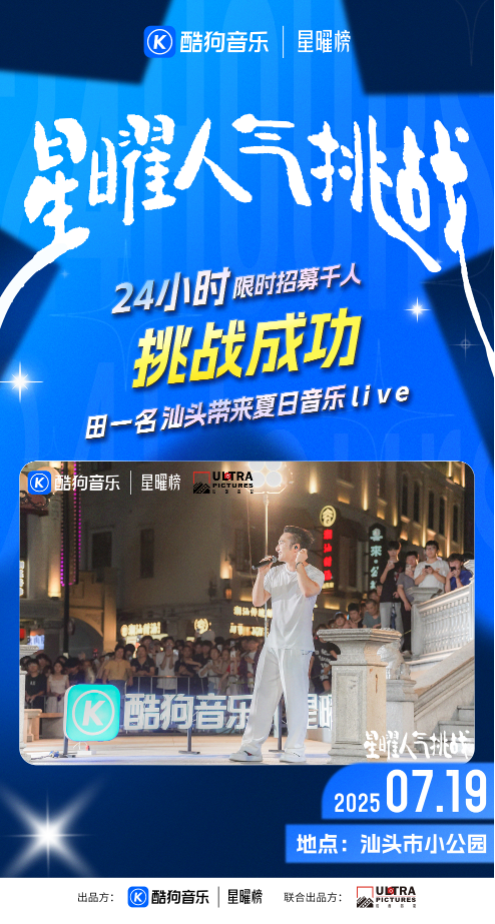 星曜人气挑战作为国民级音乐音娱一体化平台,酷狗音乐始终致力于让热爱音乐的歌手被看见,其打造的“酷狗音乐星曜榜”已成为国民流行音乐的风向标,本次“星曜人气挑战”正是衍生自“星曜”IP的重磅S+级活动。星曜人气挑战的揭幕站,酷狗音乐联合汕头文旅开启音乐狂欢,千万粉丝级歌手田一名将直面挑战:在24小时内,通过线上号召与线下互动,招募观众来到充满历史韵味的汕头市小公园,只要线下到场人数或线上微信群人数任一达到1000人,即宣告挑战成功,开启星曜舞台!