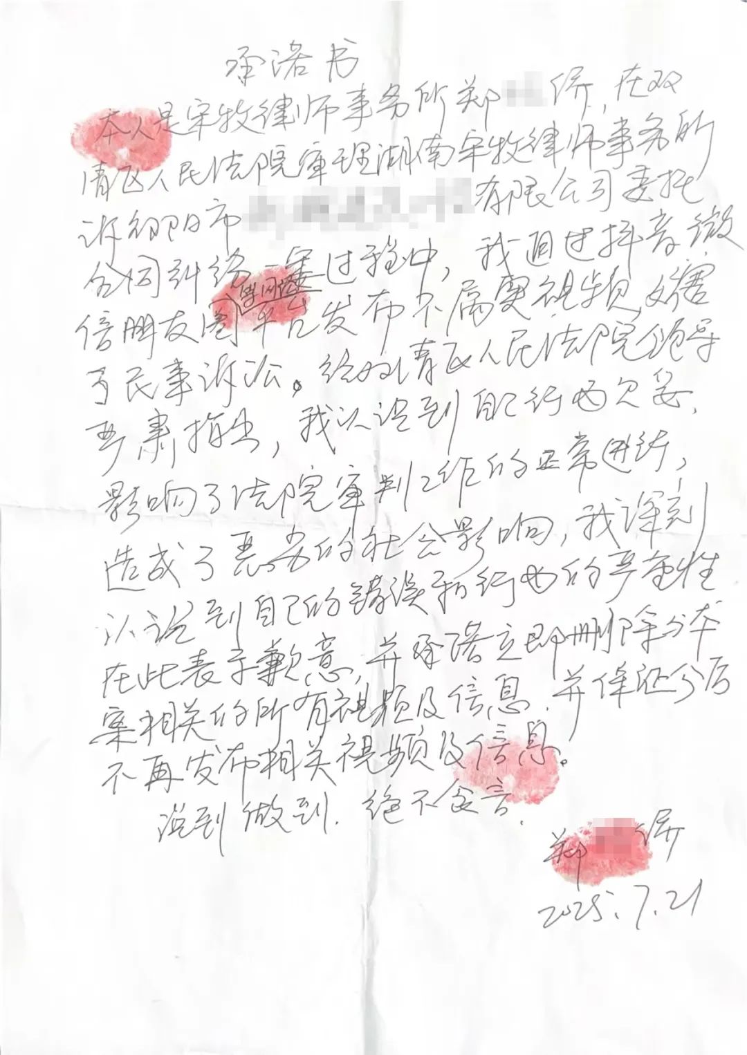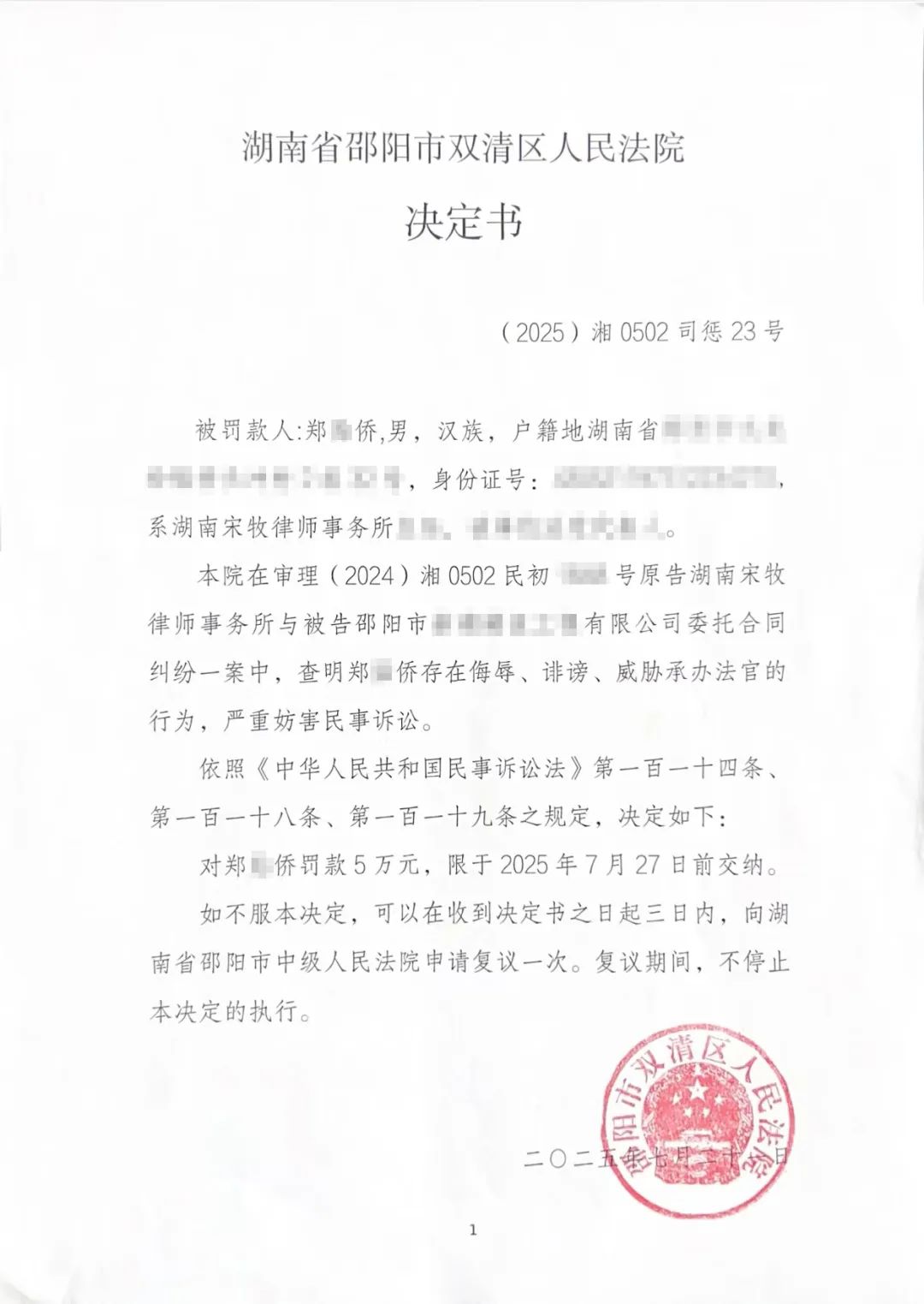 近期,湖南宋牧律师事务所及该所律师郑某侨在抖音平台、微博、微信群持续发布视频,故意歪曲事实,恶意误导舆论,大肆侮辱、诽谤我院办案法官,严重妨害民事诉讼,严重损害司法权威,造成恶劣社会影响。经我院批评教育,郑某侨深刻认识自己的错误并表示道歉。鉴于郑某侨主动删除不实视频,并保证不再发布相关视频、信息的认错态度,根据《中华人民共和国民事诉讼法》第一百一十四条、第一百一十八条、第一百一十九条之规定,我院决定对郑某侨罚款5万元。