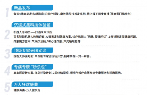 5.旅游与健康服务展区:包含健康旅游服务、线路,特色旅疗服务体验,旅疗基地等,还有健康旅游规划咨询、旅疗保险等。