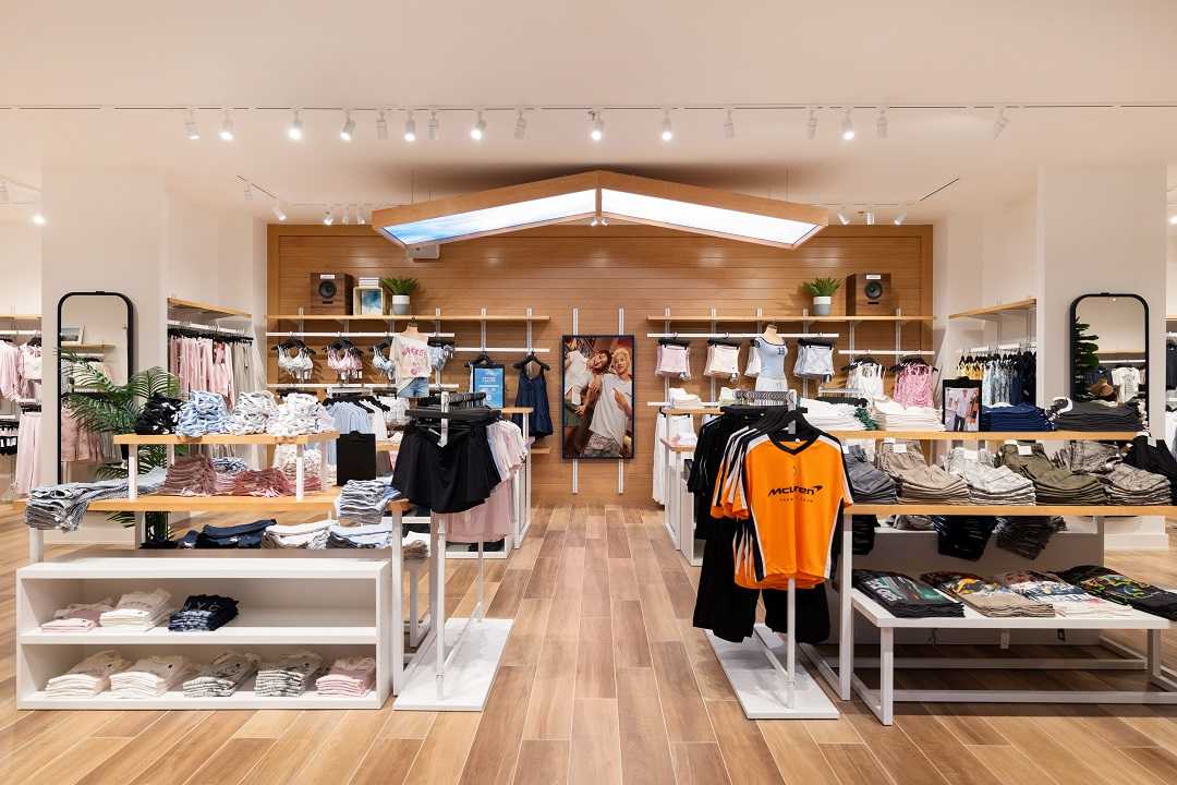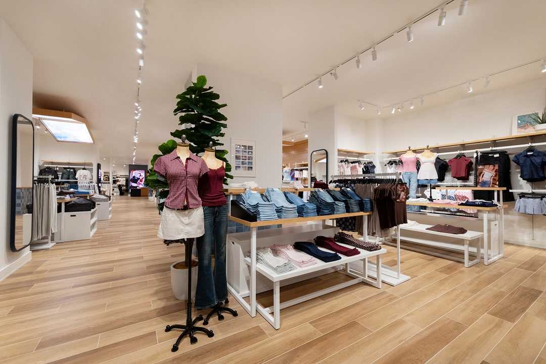 全新Hollister House的店铺设计,展现出了一场南加州风情与时尚的奇妙邂逅,巧妙地将木质地板与米白的墙面搭配,用温暖的色调打造出一个舒适又充满活力的购物天地。吸睛的天空顶设计和阔叶绿植装饰使整个空间变得明亮并充满生机;零星点缀的复古写实风格相片,更是为门店增添了来自南加州的一抹风情。此外,以海洋为灵感的蓝白色调更衣室配合带有「Feel Good」贴纸的更衣镜,在带来颇具氛围感的试穿体验的同时,也将「Feel Good」的快乐理念传递给每一位顾客。