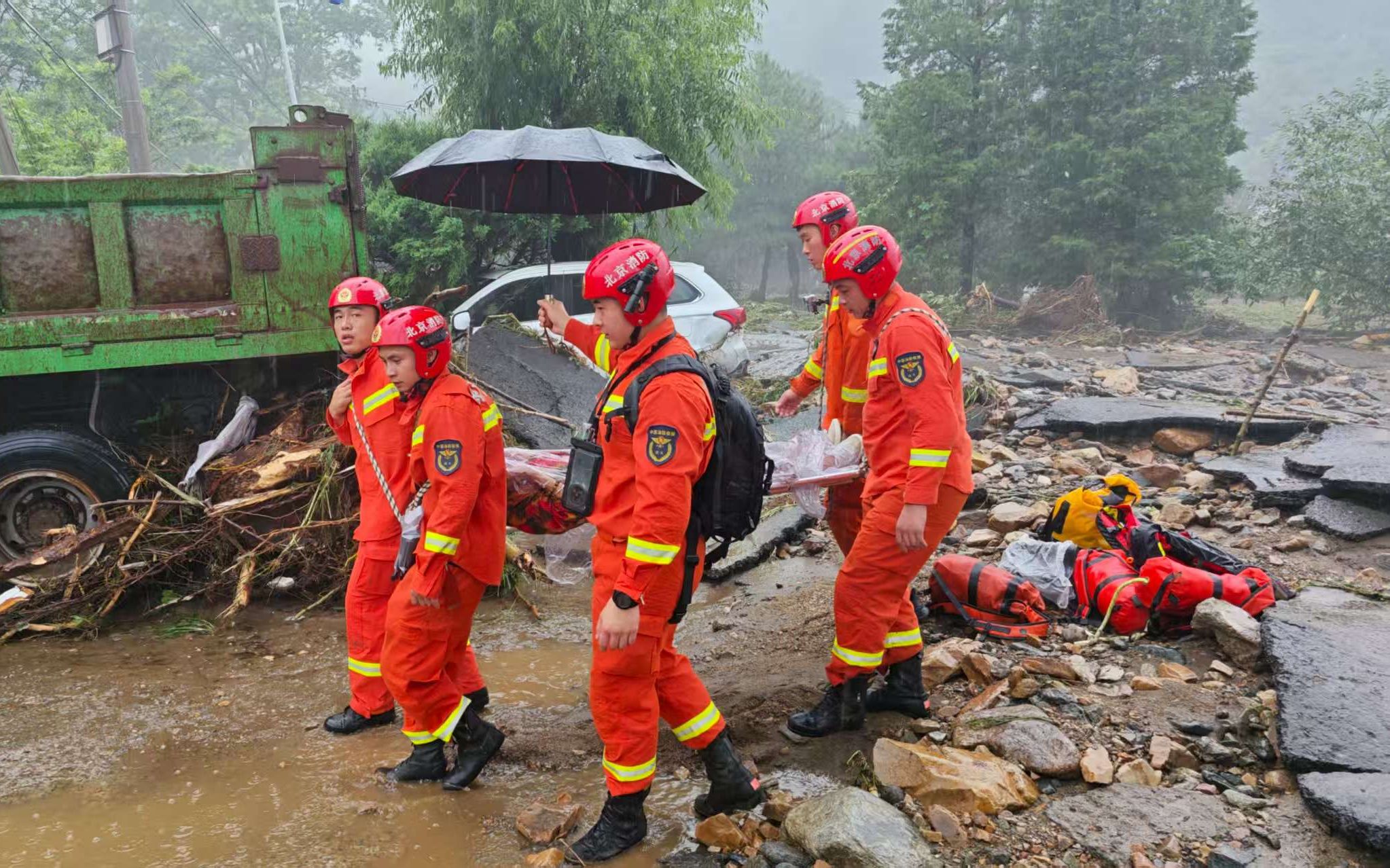 “石城镇高家岭村有村民被困,请支队前去救援,协助转移村民。”清晨6点,上山的路通了,顺义区消防救援支队接到增援高家岭村的任务。