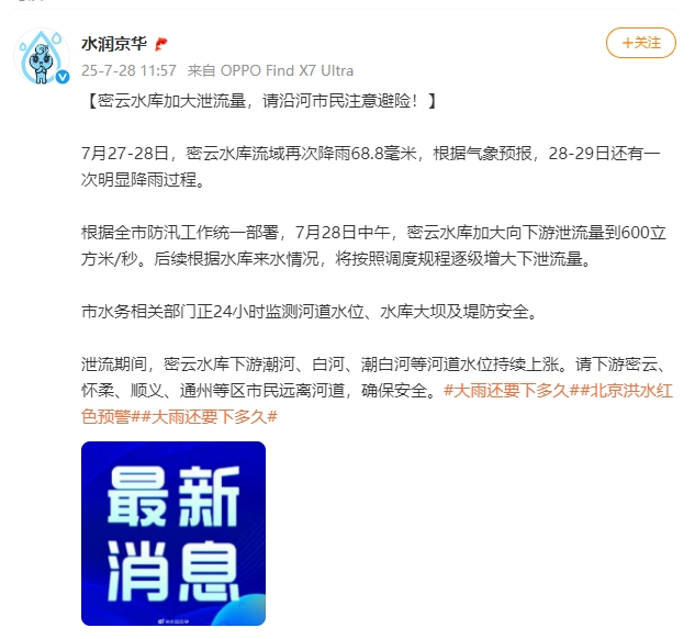 根据全市防汛工作统一部署,7月28日中午,密云水库加大向下游泄流量到600立方米/秒。后续根据水库来水情况,将按照调度规程逐级增大下泄流量。