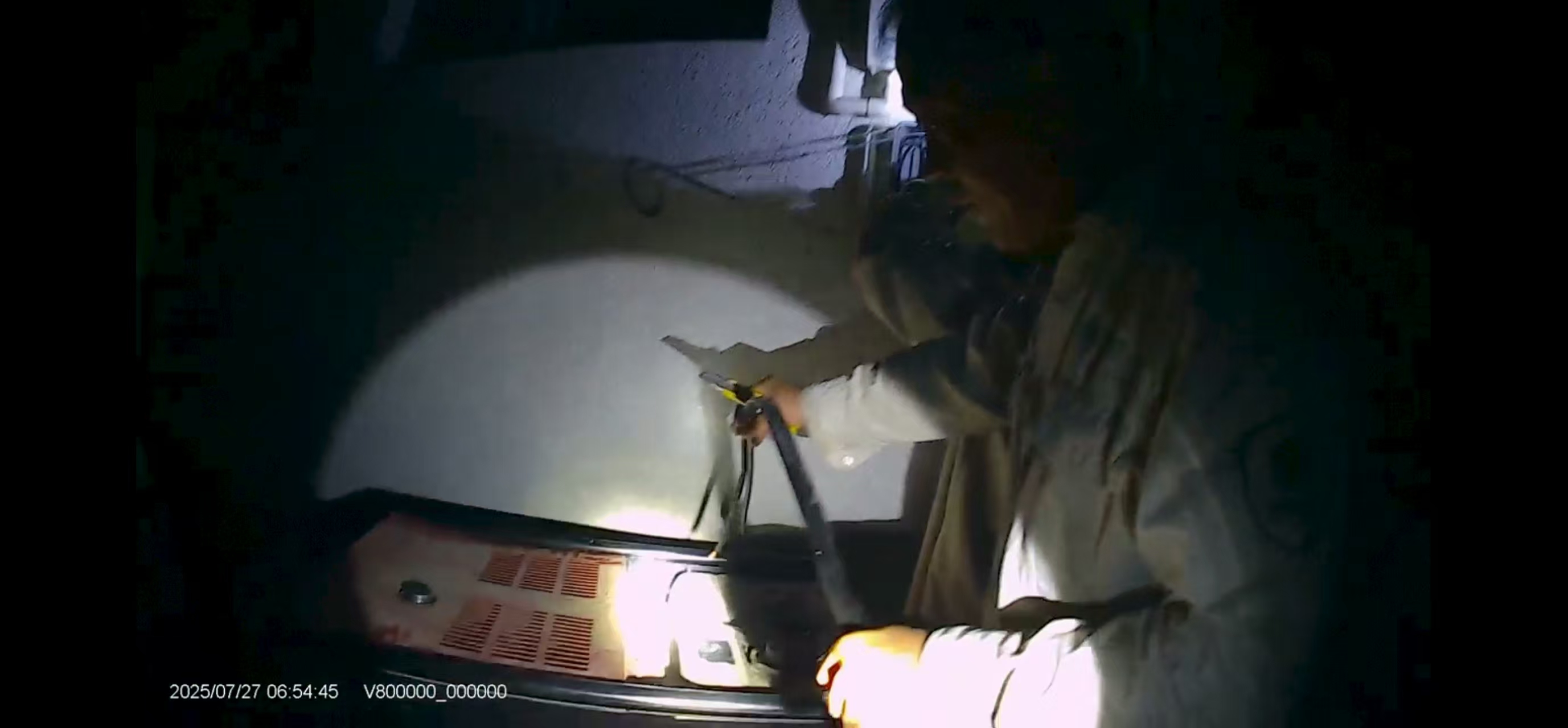27日凌晨,张德红和同事一起,用发电机为断电的吸氧老人供电。图为张德红携带的记录仪画面