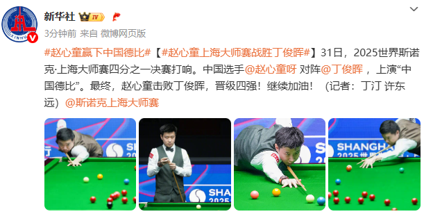 据新华社微博消息,31日,2025世界斯诺克·上海大师赛四分之一决赛打响。中国选手赵心童对阵丁俊晖 ,上演“中国德比”。最终,赵心童击败丁俊晖,晋级四强!(记者:丁汀 许东远)
