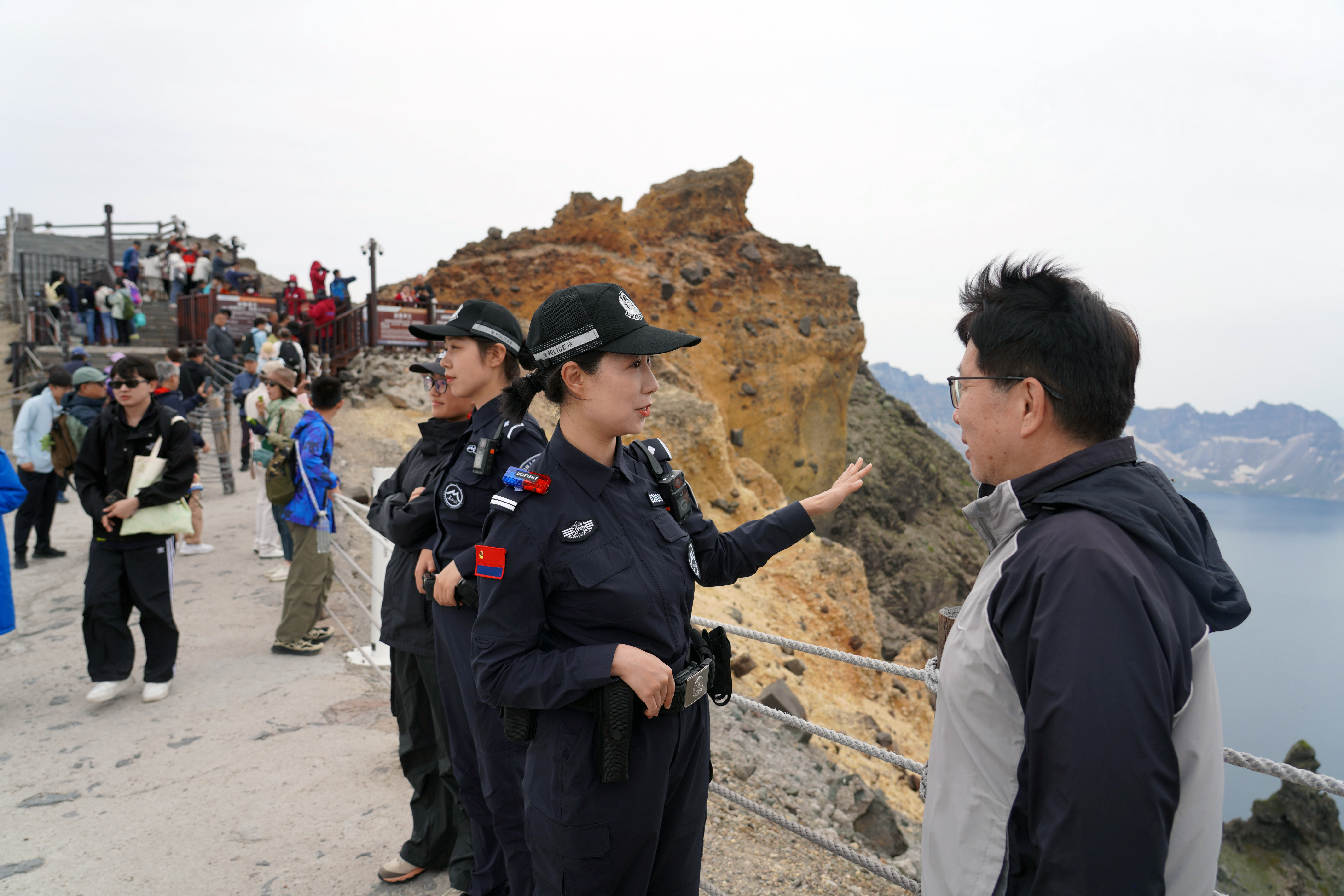 来到长白山北景区天池主峰,一队佩戴蓝色“生态旅游警察”袖标的民警在人群中穿梭,他们着装严整、精神抖擞,成为景区一道靓丽风景线,许多游客主动上前要求合影。旅游警务管理队秉持“亲民、爱民、为民”的工作理念,以游客需求为导向,采取在各景点“定点+流动”值守模式,高效开展秩序维护、纠纷化解、服务救助等工作。