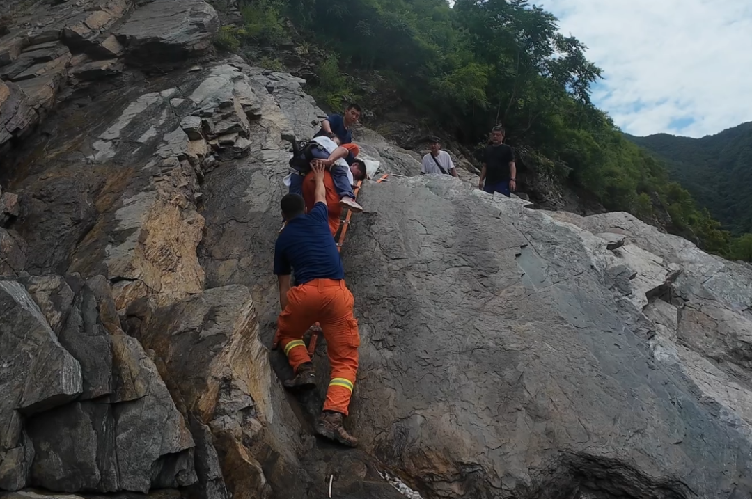 救援分队指挥员立即决定分头行动,一组人员先将小女孩及其家人安全护送下山,其余人员继续前行执行搜救任务。随即五名消防员组成护送小队,决定以最快速度把孩子送到山下。陡峭的山壁让救援担架无法发挥作用,大家用绳索小心翼翼地把女孩牢牢固定在队员遆俊龙的背上,确保孩子不会摔下来,其他人员保护辅助。