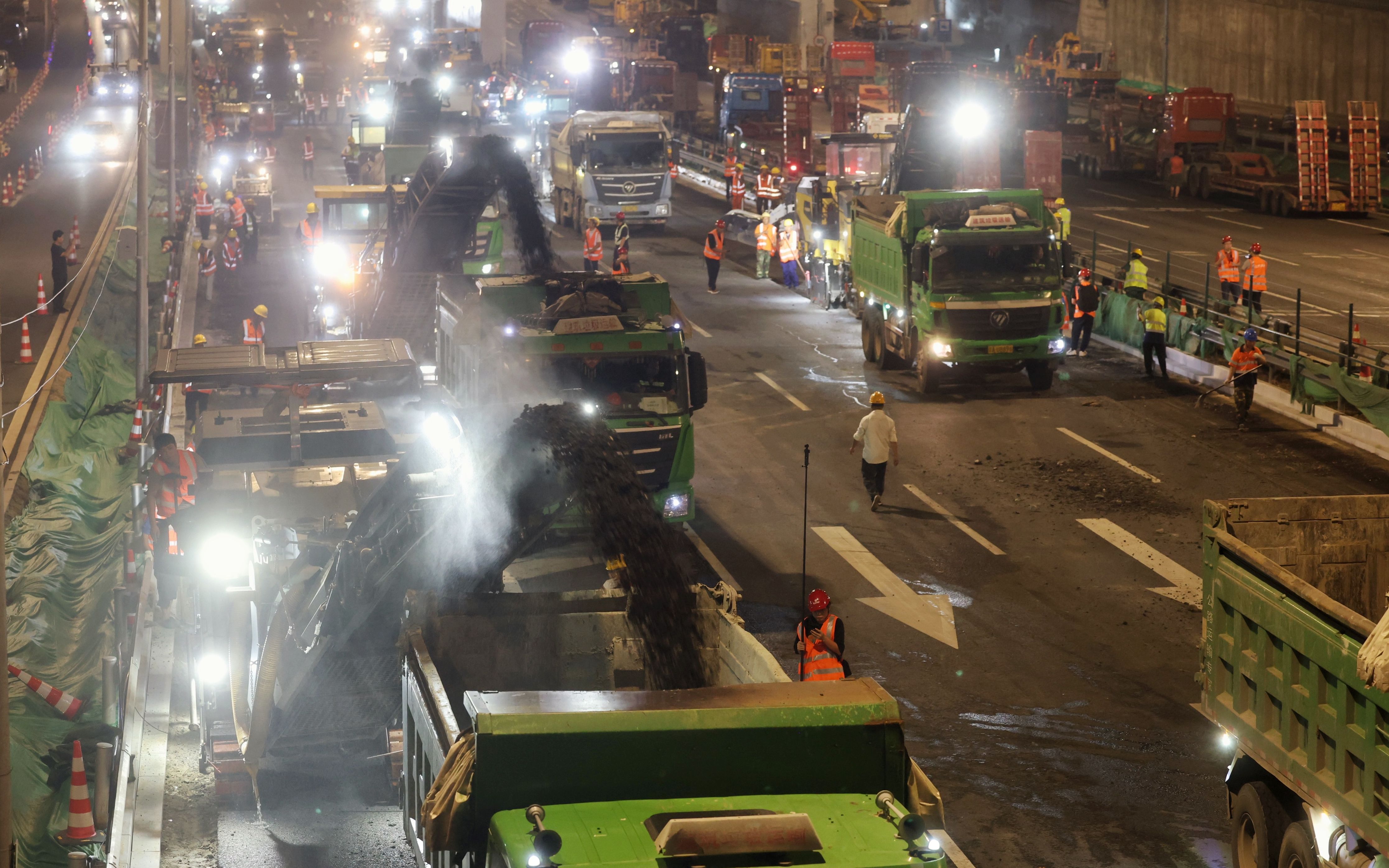目前,该工程依托市级工作专班的每日调度机制,统筹推进道路桥梁更新、交通设施优化、绿化景观提升、积水点治理、桥下空间整治、管线治理等各项工作。8月1日起,工程进入攻坚阶段,全面启动沥青混凝土路面、桥面修复和中面层摊铺工作。