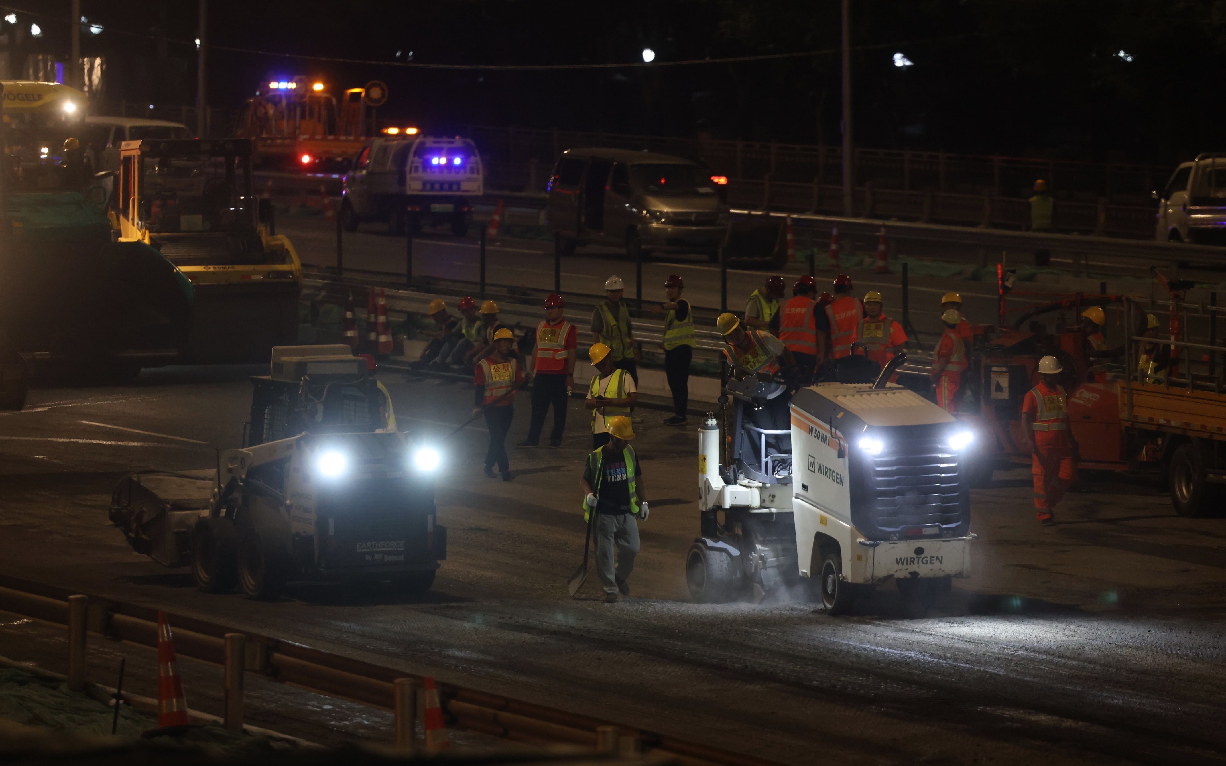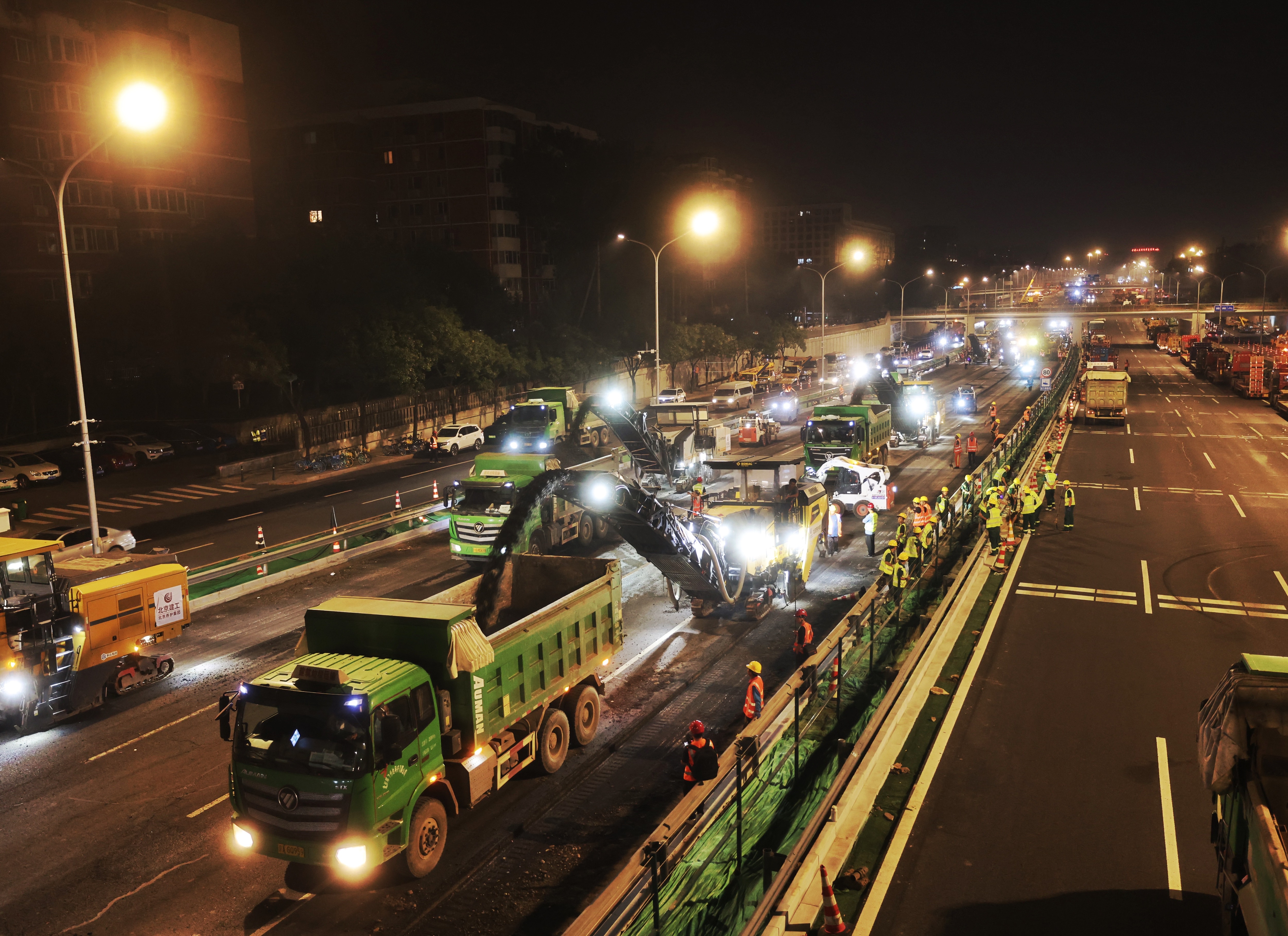 今天(8月2日)凌晨的西北四环上,众多铣刨机、装载机按照小组队列,整齐前行。此时,五棵松桥至四海桥路段正在全封闭施工,工程快速推进,将原有路面铲除,等待换上更平整的新路面。