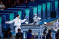 机器人伴随着歌曲《青苹果乐园》跳舞。根据《世界人形机器人运动会团体舞蹈赛规则》,所有参赛机器人在2分至2分30秒的表演时限内,各队需完成自编舞蹈动作,并接受结构设计(15分)、创意编排(15分)、多机协调性(15分)、技术难度(25分)、音舞协调性(15分)及过程稳定性(15分)六大维度的综合评判。