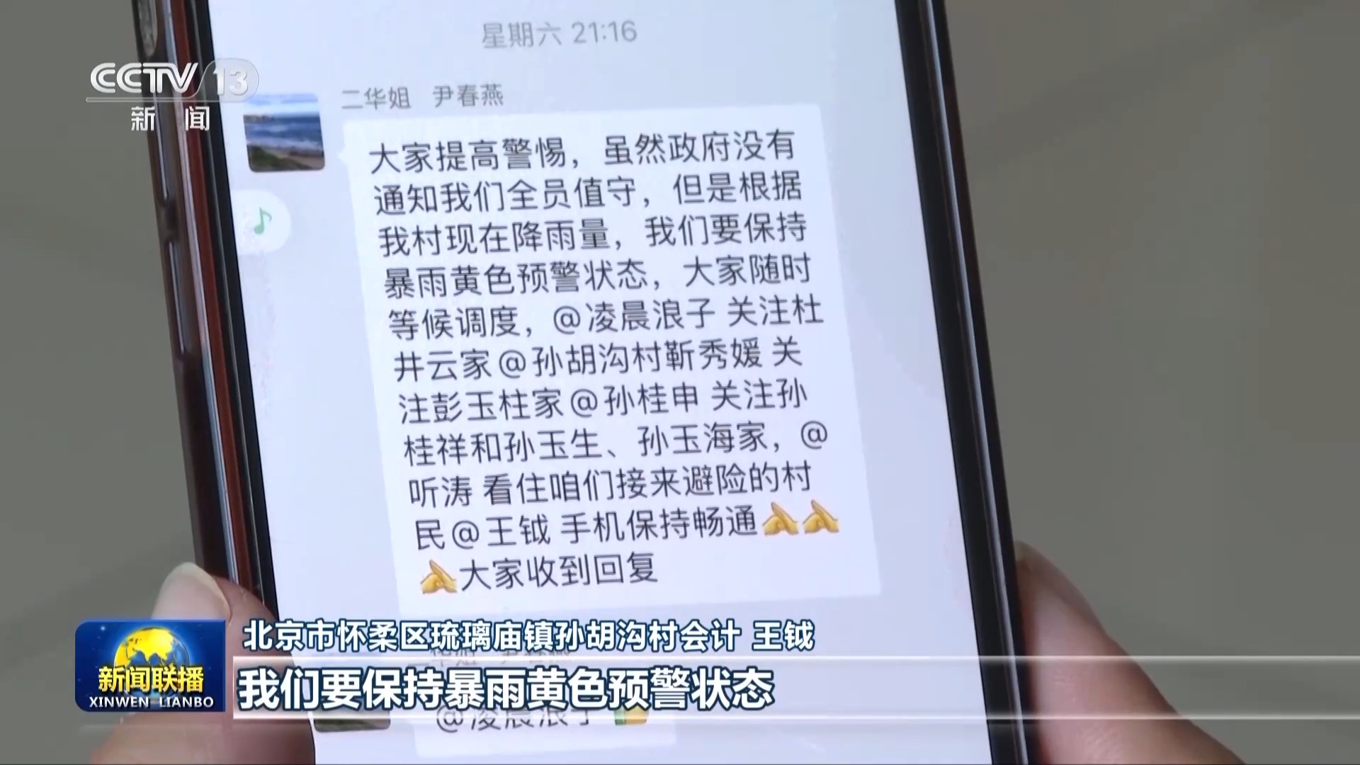 北京市怀柔区琉璃庙镇孙胡沟村会计 王钺:书记发布了一条文字(消息),根据我村现在降雨量,我们要保持暴雨黄色预警状态,大家随时等候调度。