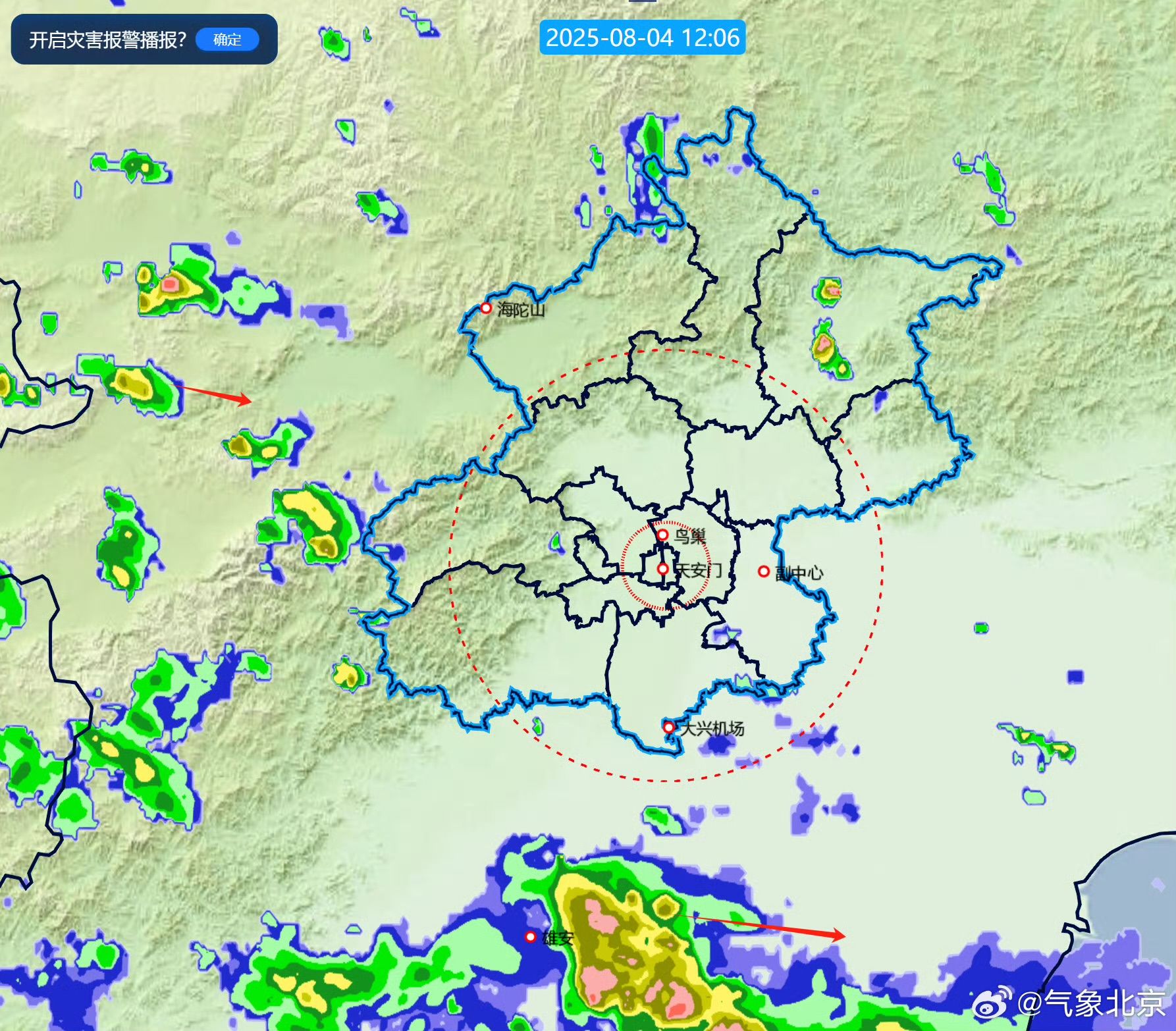 8月4日12时06分,北京西部上游有分散回波东移。图源:气象北京