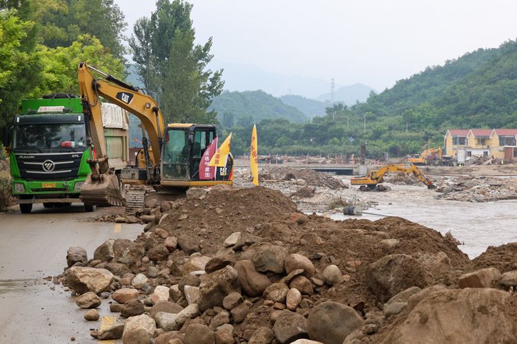 8月4日上午,密云区,紧邻白马关河的西火路上,挖掘机对路面进行加固。市规划自然资源委提示:8月4日12时-8月5日12时,房山区、门头沟区、昌平区、延庆区、怀柔区、密云区山区道路沿线局部路段山体斜坡发生崩塌灾害的风险较高,请注意防范。