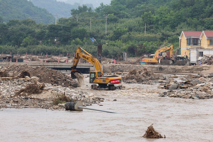 8月4日上午,密云区白马关河,挖掘机在河道清淤。北京市气象台8月4日13时0分升级发布暴雨红色预警信号。预计今日午后开始,我市将出现强降雨天气,最强降雨集中在4日18时至5日5时,该期间部分地区6小时降雨量可达150毫米以上,个别点位200毫米以上,山区及浅山区出现山洪、泥石流、滑坡等灾害的风险极高,低洼地区极易出现积水,请注意防范。
