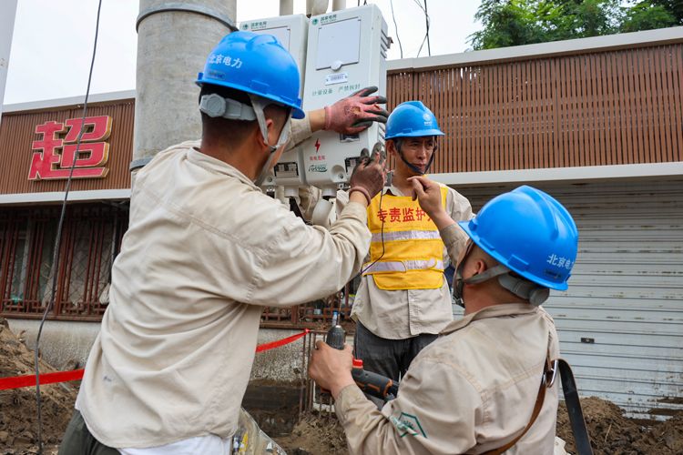 8月4日上午,密云区冯家峪镇冯家峪村,电力工作人员正在检查、更换设备。