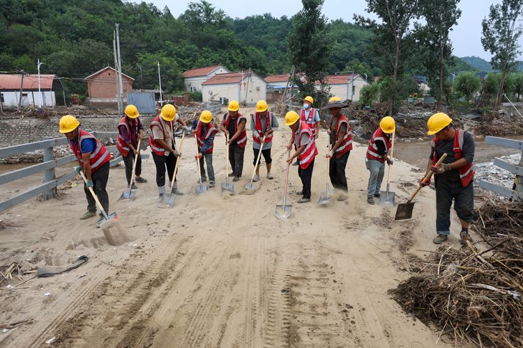 8月4日,密云区冯家峪镇,工人清理桥梁路面上的淤泥。