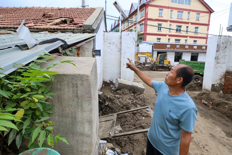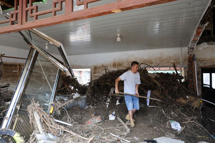 8月4日,冯家峪镇冯家峪村,村民清理房屋淤泥。