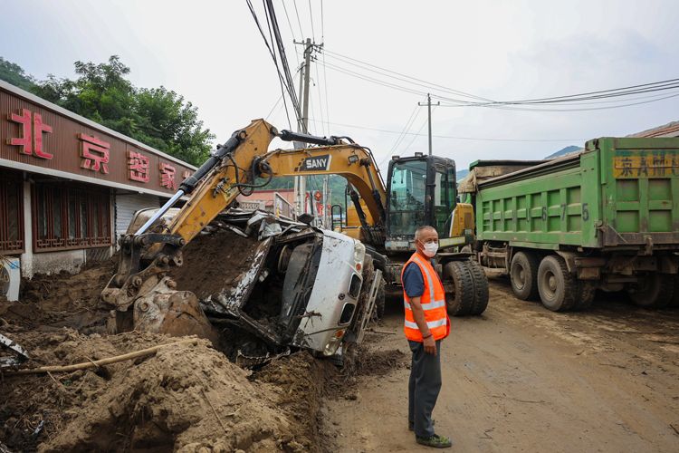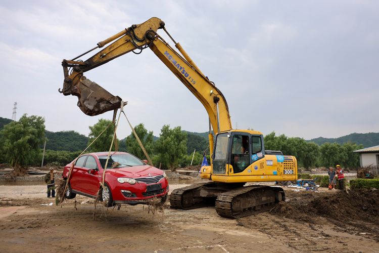 8月4日上午,密云区冯家峪镇西庄子村,挖掘机处置损毁车辆。