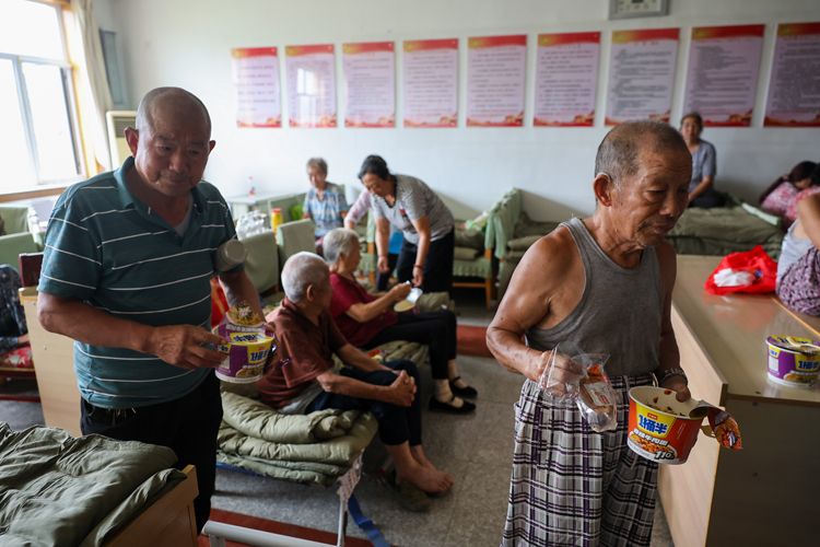 8月4日,密云区冯家峪镇西庄子村村民委员会,被安置的老人准备吃面。